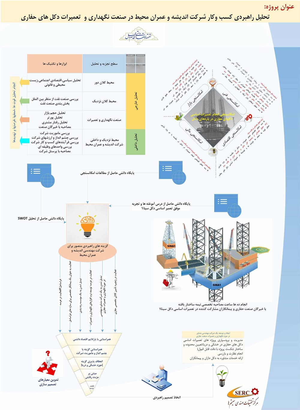 با هدف بررسی همه جانبه بازار ارتقاء، نگهداری و تعمیرات دکلهای حفاری جک آپ و شناخت بهتر کسب و کار شرکت اندیشه و عمران محیط در این حوزه، این پروژه مطالعاتی تعریف گردید و انجام آن به مرکز تحقیقات مهندسی سیستمها و نظارت بر اجرای آن بر عهده اینجانب واگذار گردید.
